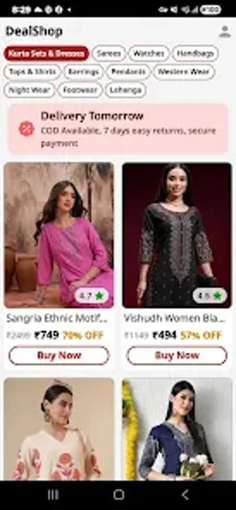DealShop is a free Android application designed for fashion enthusiasts in India, offering a curated selection of clothing and accessories tailored to daily style needs. Users can explore fresh arrivals each day, ensuring they have access to the latest trends and seasonal collections. The app emphasizes convenience with features like quick day delivery and a straightforward return policy, making it easier for users to shop without worry.